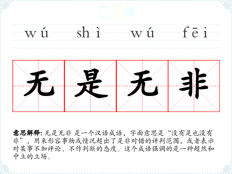 无是无非 是一个汉语成语,字面意思是“没有是也没有非”,用来形容事物或情况超出了是非对错的评判范围,或者表示对某事不加评论、不作判断的态度。这个成语强调的是一种超然和中立的立场。