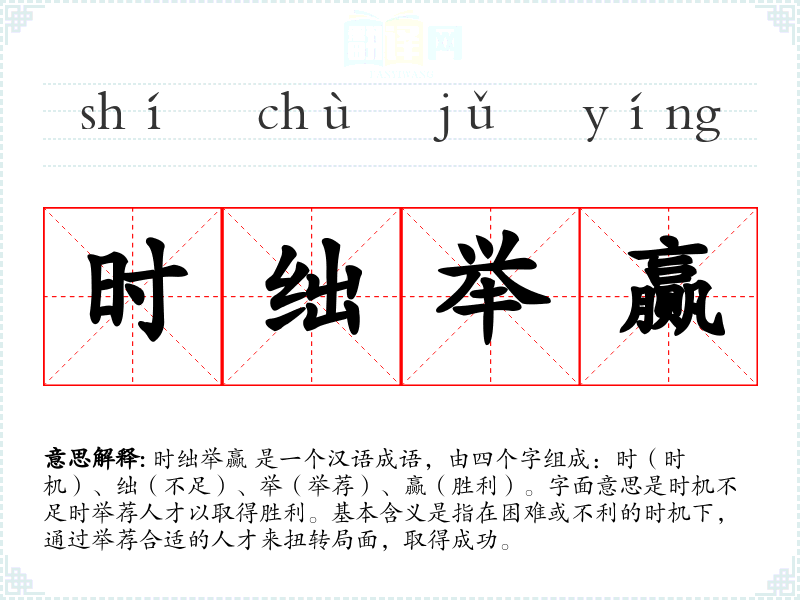 时绌举赢 是一个汉语成语,由四个字组成:时(时机)、绌(不足)、举(举荐)、赢(胜利)。字面意思是时机不足时举荐人才以取得胜利。基本含义是指在困难或不利的时机下,通过举荐合适的人才来扭转局面,取得成功。