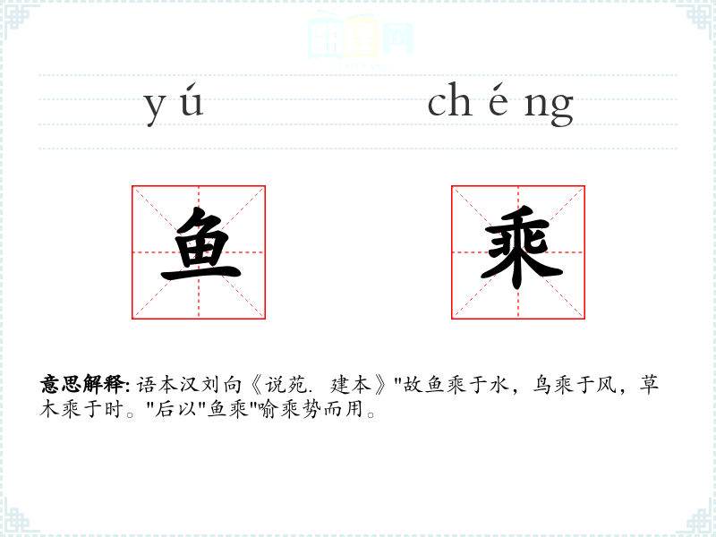 语本汉刘向《说苑.建本》"故鱼乘于水,鸟乘于风,草木乘于时。"后以"鱼乘"喻乘势而用。