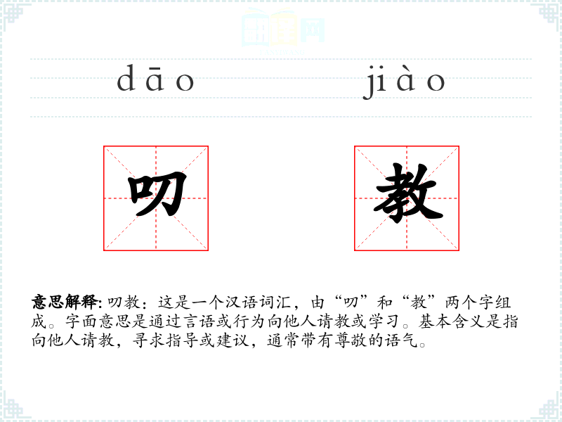 叨教:这是一个汉语词汇,由“叨”和“教”两个字组成。字面意思是通过言语或行为向他人请教或学*。基本含义是指向他人请教,寻求指导或建议,通常带有尊敬的语气。