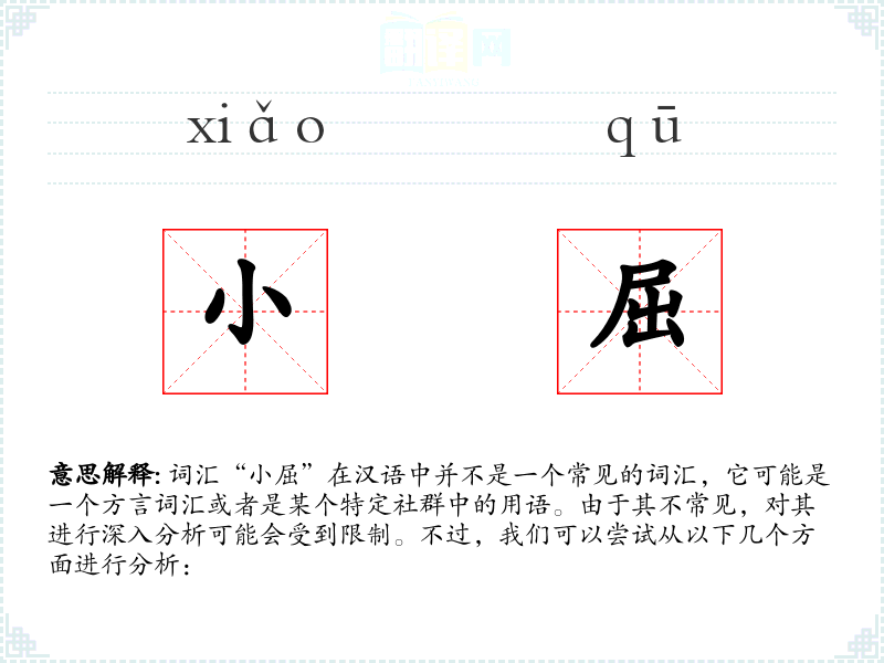 由于“小屈”不是一个标准词汇,对其的理解和分析受到限制。在语言学习和表达中,了解和使用标准词汇更为重要。如果“小屈”是一个方言词汇或特定社群中的用语,了解其具体含义和用法可能需要更多的研究和了解。
