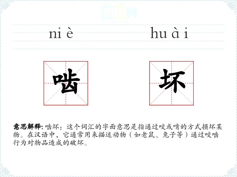 啮坏:这个词汇的字面意思是指通过咬或啃的方式损坏某物。在汉语中,它通常用来描述动物(如老鼠、兔子等)通过咬啮行为对物品造成的破坏。