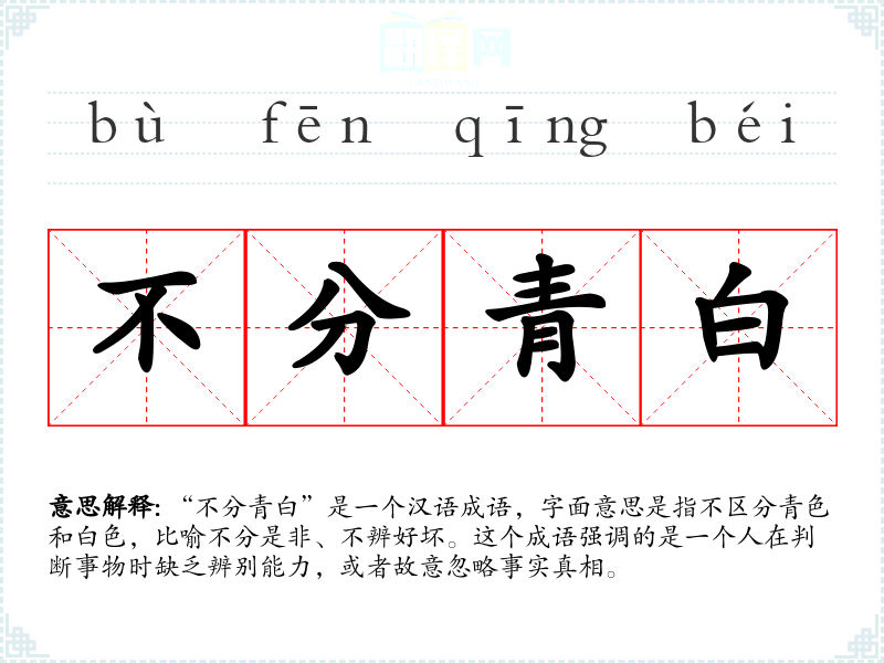 “不分青白”是一个汉语成语,字面意思是指不区分青色和白色,比喻不分是非、不辨好坏。这个成语强调的是一个人在判断事物时缺乏辨别能力,或者故意忽略事实真相。