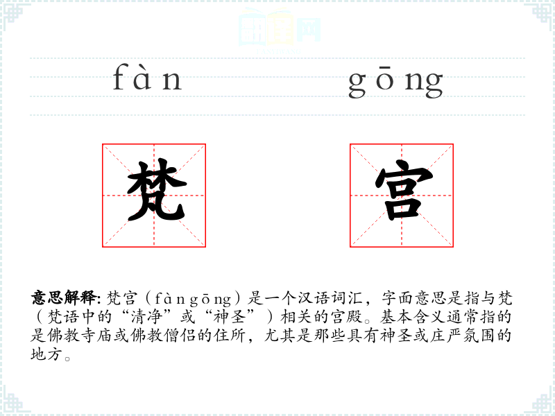 梵宫(fàn gōng)是一个汉语词汇,字面意思是指与梵(梵语中的“清净”或“神圣”)相关的宫殿。基本含义通常指的是寺庙或僧侣的住所,尤其是那些具有神圣或庄严氛围的地方。