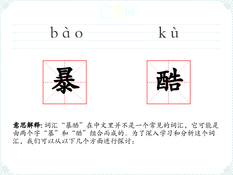 词汇“暴酷”在中文里并不是一个常见的词汇,它可能是由两个字“暴”和“酷”组合而成的。为了深入学习和分析这个词汇,我们可以从以下几个方面进行探讨:
