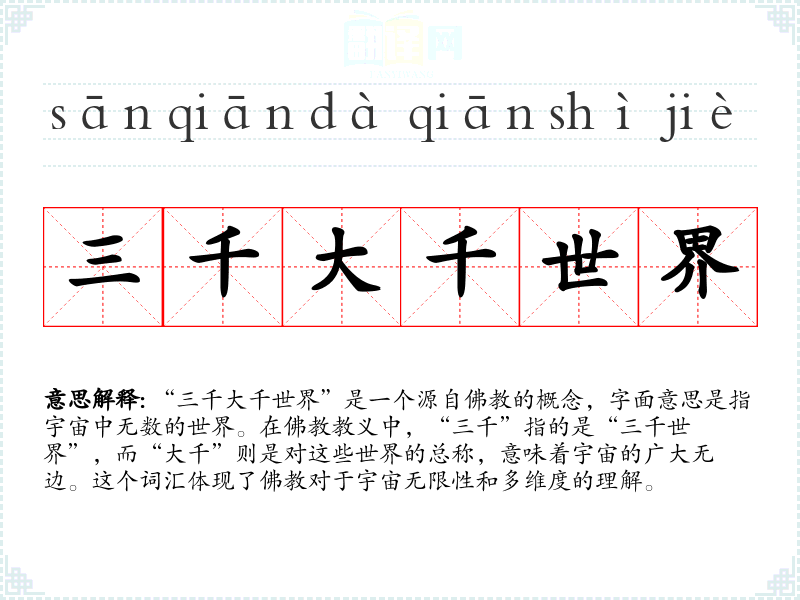 “三千大千世界”是一个源自的概念,字面意思是指宇宙中无数的世界。在教义中,“三千”指的是“三千世界”,而“大千”则是对这些世界的总称,意味着宇宙的广大无边。这个词汇体现了**对于宇宙无限性和多维度的理解。