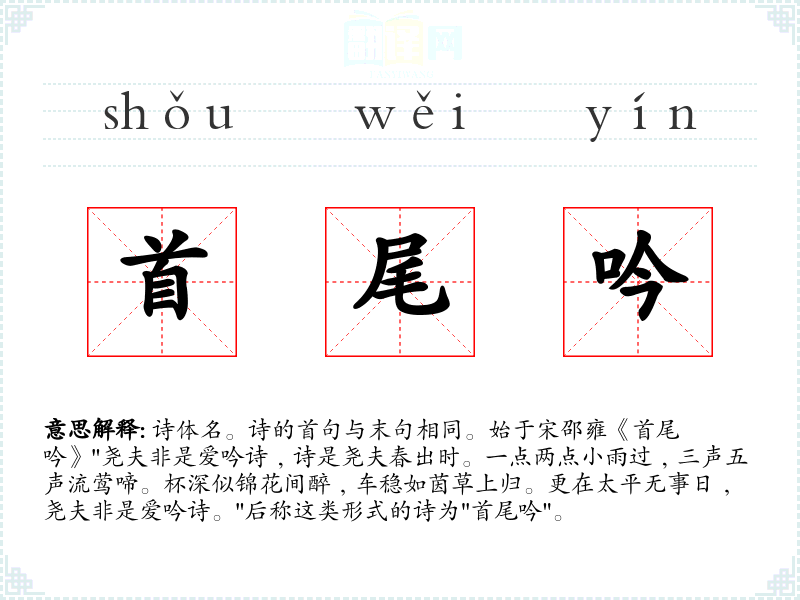 1.诗体名。诗的首句与末句相同。始于宋邵雍《首尾吟》"尧夫非是爱吟诗﹐诗是尧夫春出时。一点两点小雨过﹐三声五声流莺啼。杯深似锦花间醉﹐车稳如茵草上归。更在太平无事日﹐尧夫非是爱吟诗。"后称这类形式的诗为"首尾吟"。