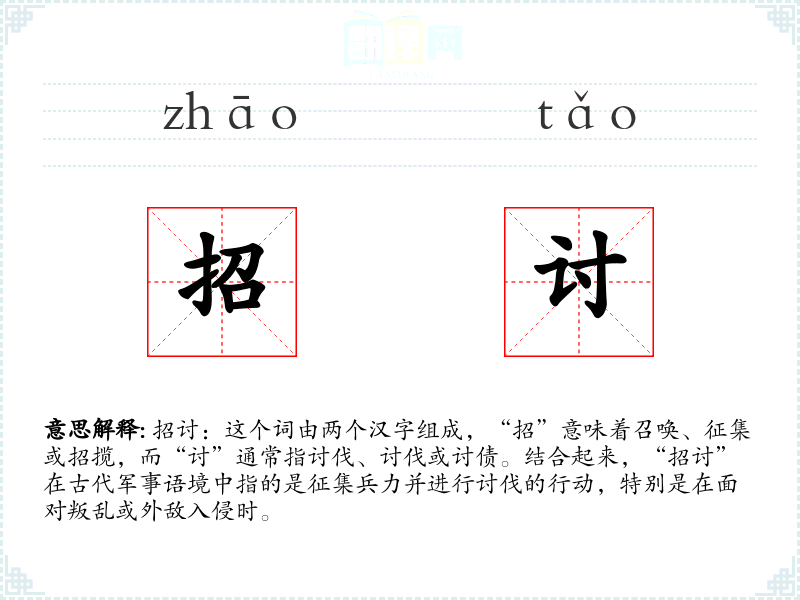 招讨:这个词由两个汉字组成,“招”意味着召唤、征集或招揽,而“讨”通常指讨伐、讨伐或讨债。结合起来,“招讨”在古代军事语境中指的是征集兵力并进行讨伐的行动,特别是在面对叛乱或外敌入侵时。
