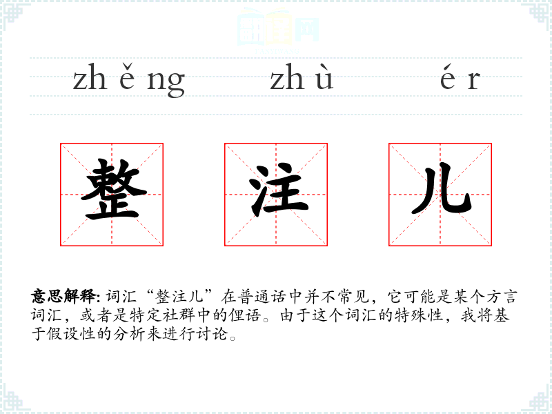 词汇“整注儿”在普通话中并不常见,它可能是某个方言词汇,或者是特定社群中的俚语。由于这个词汇的特殊性,我将基于假设性的分析来进行讨论。