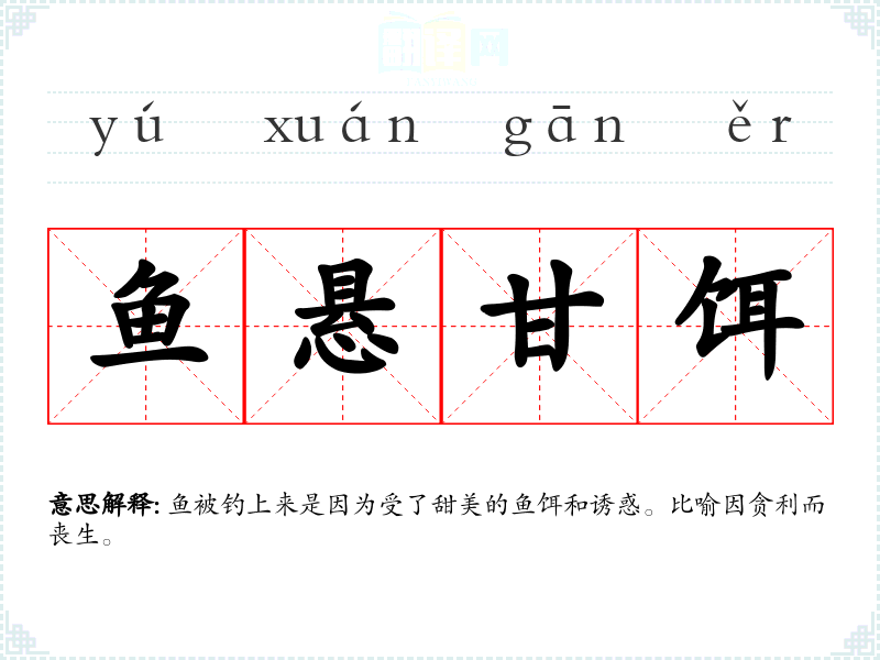鱼被钓上来是因为受了甜美的鱼饵和诱惑。比喻因贪利而丧生。