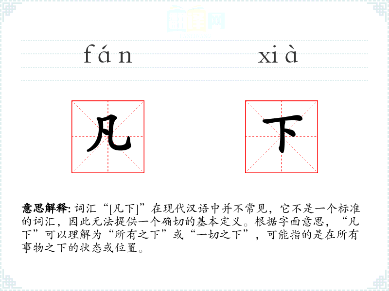词汇“[凡下]”在现代汉语中并不常见,它不是一个标准的词汇,因此无法提供一个确切的基本定义。根据字面意思,“凡下”可以理解为“所有之下”或“一切之下”,可能指的是在所有事物之下的状态或位置。