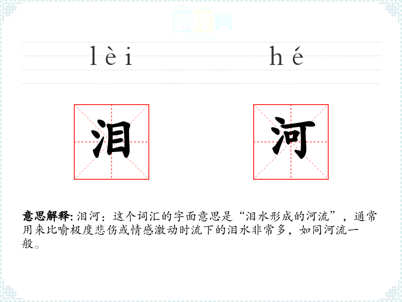 泪河:这个词汇的字面意思是“泪水形成的河流”,通常用来比喻极度悲伤或情感激动时流下的泪水非常多,如同河流一般。