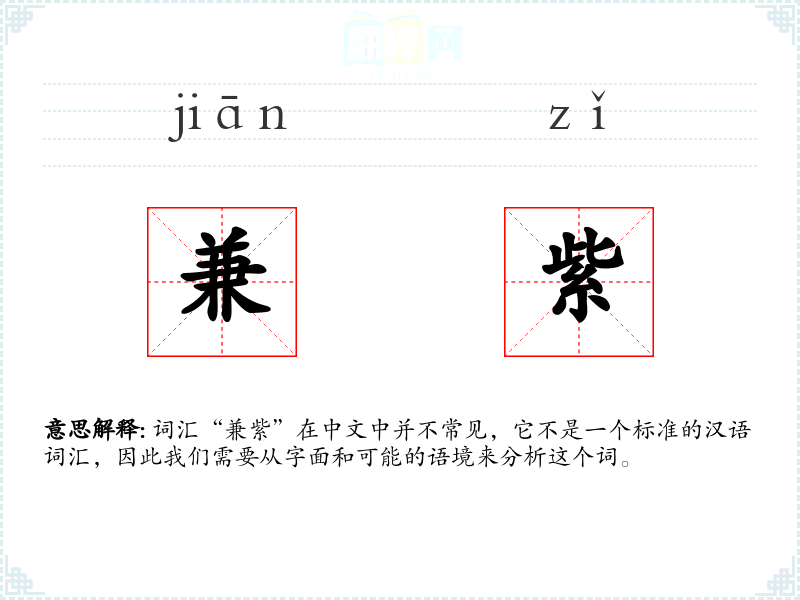 词汇“兼紫”在中文中并不常见,它不是一个标准的汉语词汇,因此我们需要从字面和可能的语境来分析这个词。