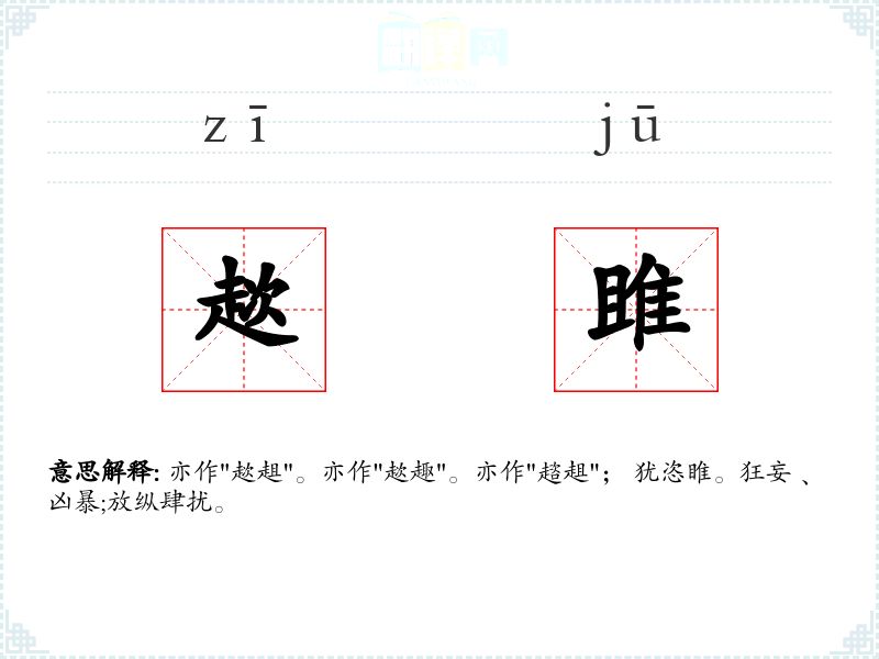 亦作"趑趄"。亦作"趑趣"。亦作"趦趄"; 犹恣睢。狂妄﹑凶暴;放纵肆扰。