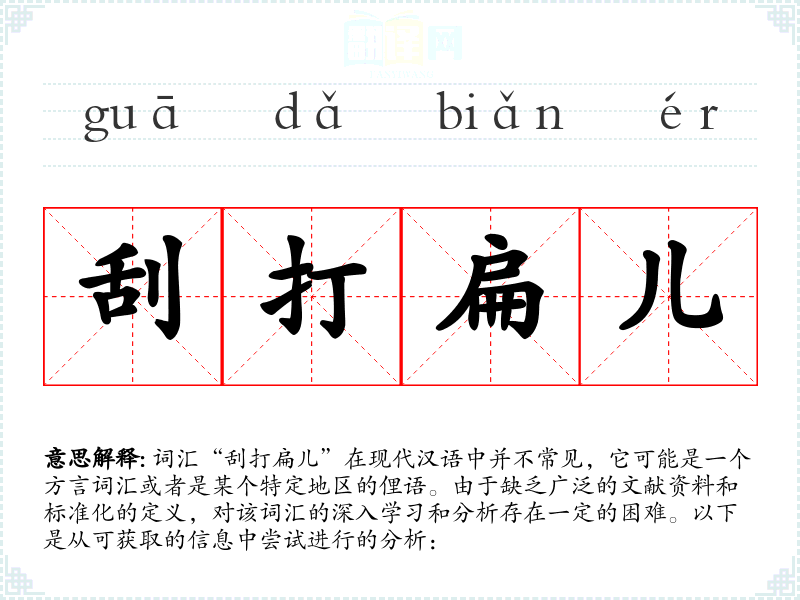词汇“刮打扁儿”在现代汉语中并不常见,它可能是一个方言词汇或者是某个特定地区的俚语。由于缺乏广泛的文献资料和标准化的定义,对该词汇的深入学习和分析存在一定的困难。以下是从可获取的信息中尝试进行的分析: