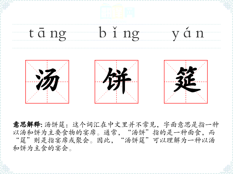 汤饼筵:这个词汇在中文里并不常见,字面意思是指一种以汤和饼为主要食物的宴席。通常,“汤饼”指的是一种面食,而“筵”则是指宴席或聚会。因此,“汤饼筵”可以理解为一种以汤和饼为主食的宴会。