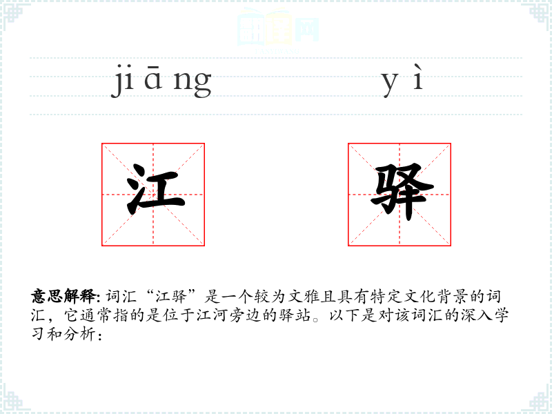 词汇“江驿”是一个较为文雅且具有特定文化背景的词汇,它通常指的是位于江河旁边的驿站。以下是对该词汇的深入学*和分析: