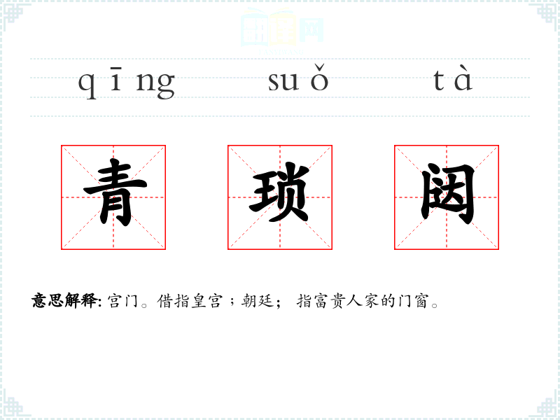 宫门。借指皇宫﹔朝廷; 指富贵人家的门窗。