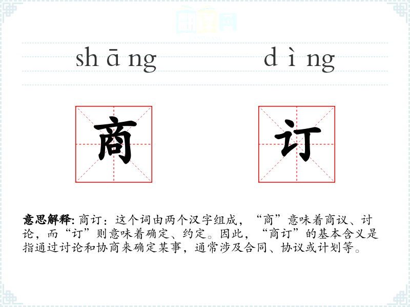 商订:这个词由两个汉字组成,“商”意味着商议、讨论,而“订”则意味着确定、约定。因此,“商订”的基本含义是指通过讨论和协商来确定某事,通常涉及合同、协议或计划等。