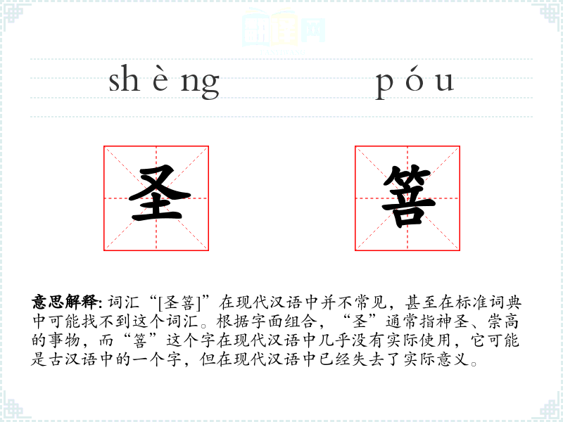 词汇“[圣箁]”在现代汉语中并不常见,甚至在标准词典中可能找不到这个词汇。根据字面组合,“圣”通常指神圣、崇高的事物,而“箁”这个字在现代汉语中几乎没有实际使用,它可能是古汉语中的一个字,但在现代汉语中已经失去了实际意义。