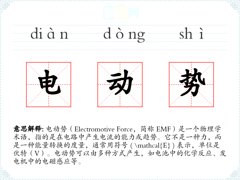 电动势这个概念起源于19世纪,当时科学家们开始研究电磁现象。"Electromotive" 源自拉丁语 "electrum"(意为“琥珀”,古希腊人用琥珀摩擦产生静电)和 "motivus"(意为“移动的”),而 "Force" 则直接来自英语,意为“力”。