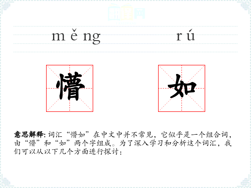 词汇“懵如”在中文中并不常见,它似乎是一个组合词,由“懵”和“如”两个字组成。为了深入学习和分析这个词汇,我们可以从以下几个方面进行探讨: