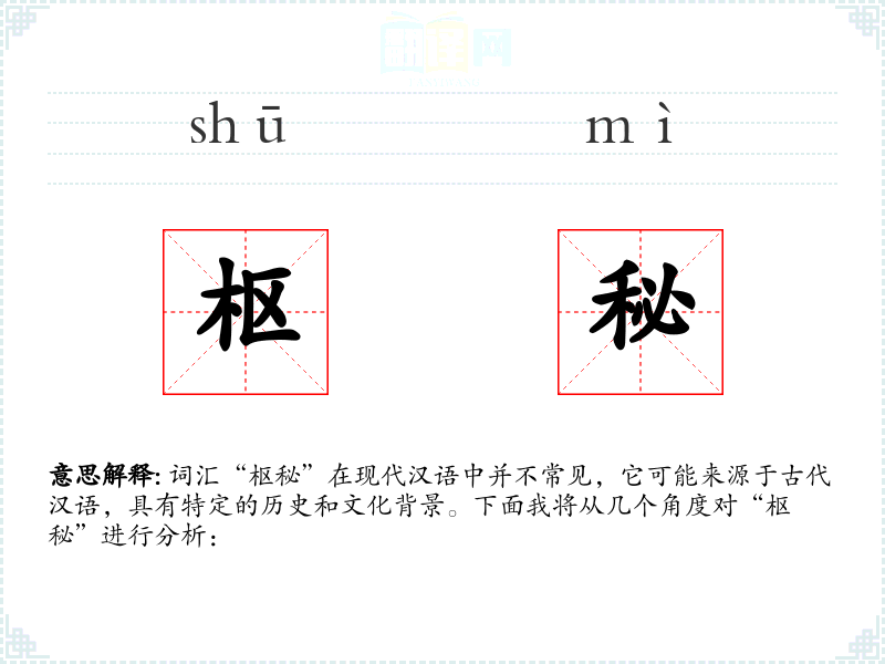 “枢秘”字面意思是指重要的秘密或机密。其中,“枢”指的是事物的关键或中心部分,“秘”则表示秘密或不公开。结合起来,“枢秘”通常指的是极为重要且不为人知的秘密。