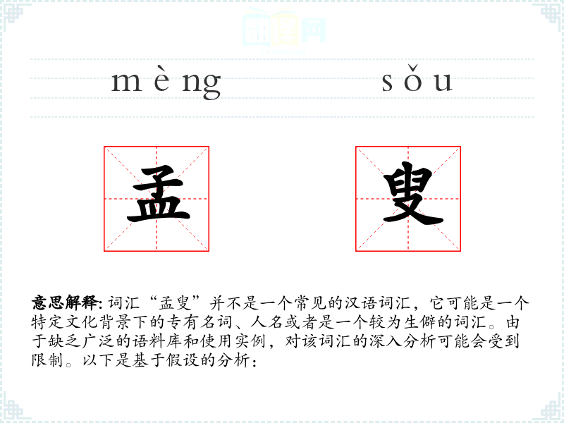 词汇“孟叟”并不是一个常见的汉语词汇,它可能是一个特定文化背景下的专有名词、人名或者是一个较为生僻的词汇。由于缺乏广泛的语料库和使用实例,对该词汇的深入分析可能会受到限制。以下是基于假设的分析:
