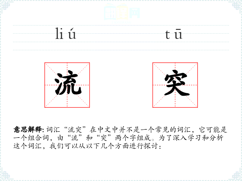 “流突”这个词不是一个标准词汇,它的使用非常有限。在分析这个词汇时,我们更多地是在进行一种假设性的探讨。在语言学习和表达中,了解词汇的标准用法和含义是非常重要的,而像“流突”这样的非标准词汇则需要更多的上下文来理解其意义。