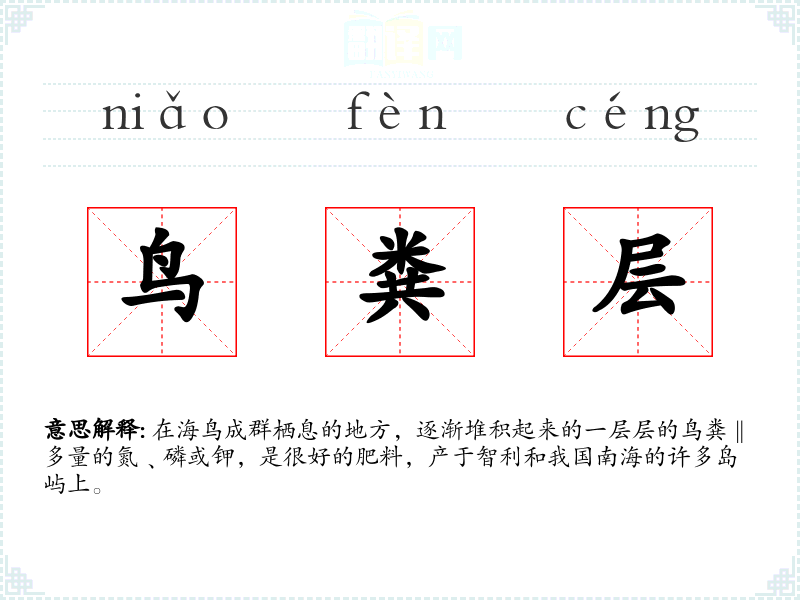 在海鸟成群栖息的地方,逐渐堆积起来的一层层的鸟粪‖多量的氮﹑磷或钾,是很好的肥料,产于智利和我国南海的许多岛屿上。