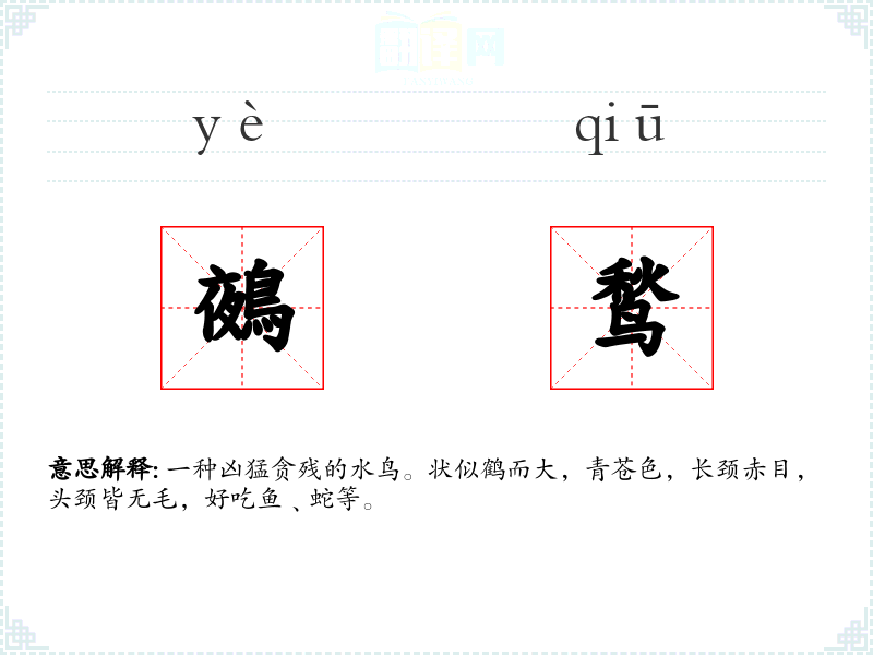 一种凶猛贪残的水鸟。状似鹤而大,青苍色,长颈赤目,头颈皆无毛,好吃鱼﹑蛇等。