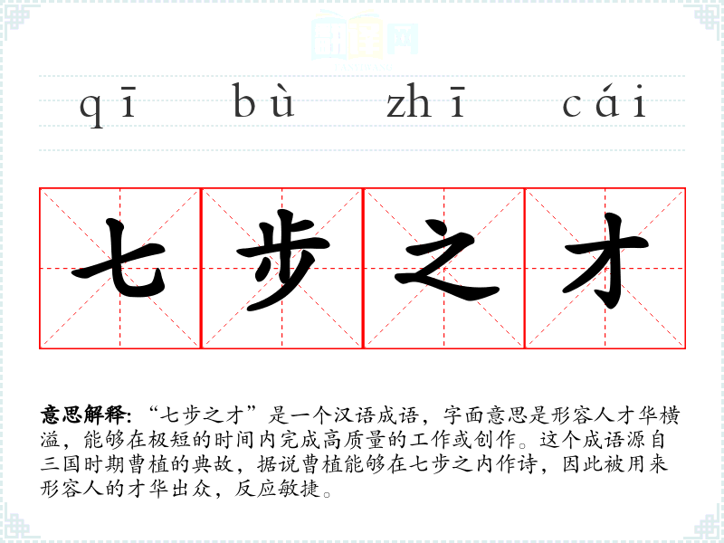 “七步之才”是一个汉语成语,字面意思是形容人才华横溢,能够在极短的时间内完成高质量的工作或创作。这个成语源自三国时期曹植的典故,据说曹植能够在七步之内作诗,因此被用来形容人的才华出众,反应敏捷。