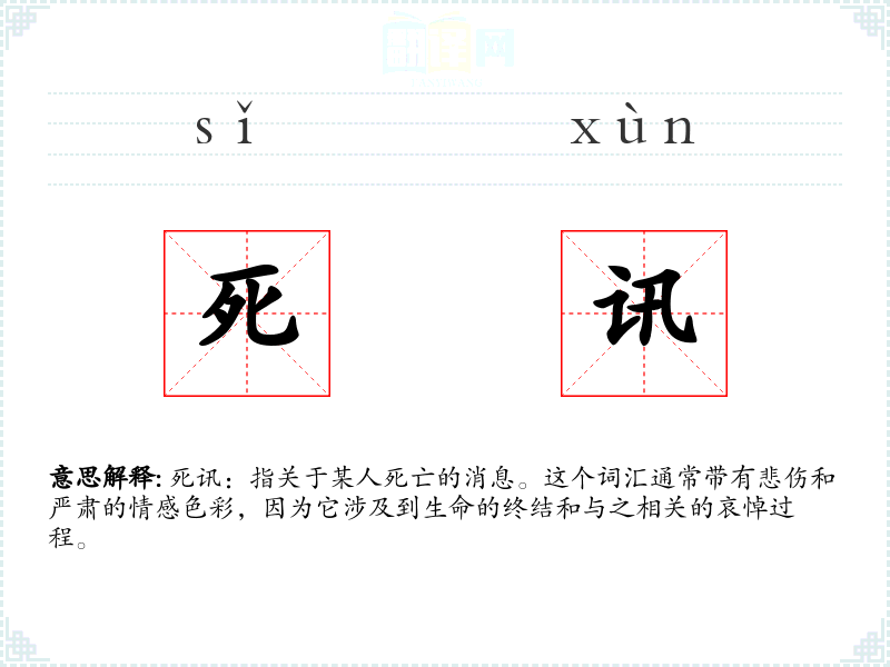 死讯:指关于某人死亡的消息。这个词汇通常带有悲伤和严肃的情感色彩,因为它涉及到生命的终结和与之相关的哀悼过程。