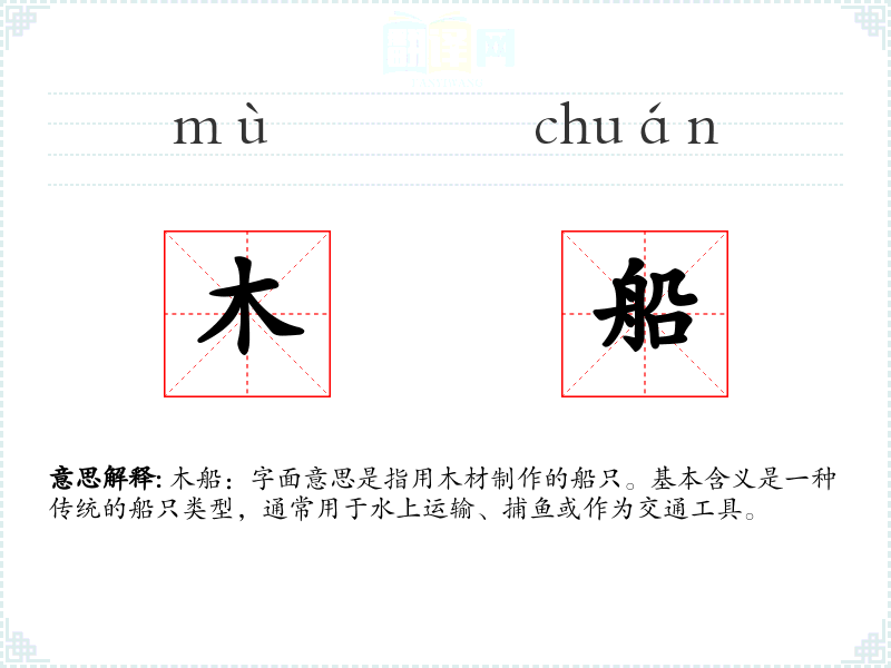木船:字面意思是指用木材制作的船只。基本含义是一种传统的船只类型,通常用于水上运输、捕鱼或作为交通工具。