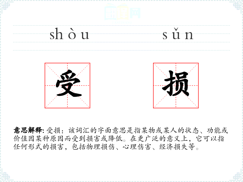 受损:该词汇的字面意思是指某物或某人的状态、功能或价值因某种原因而受到损害或降低。在更广泛的意义上,它可以指任何形式的损害,包括物理损伤、心理伤害、经济损失等。