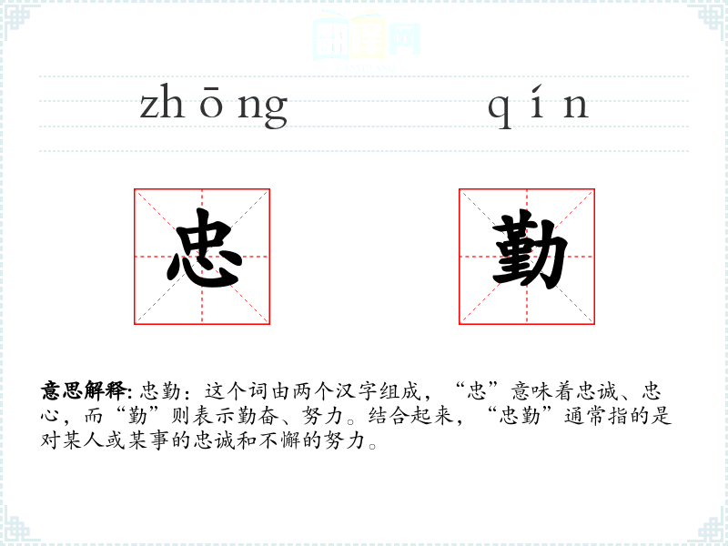 “忠”字最早见于甲骨文,原意为心中无私,后引申为忠诚。“勤”字则源于古代对劳动的描述,逐渐演变为勤奋的意思。两者结合,形成了“忠勤”这一复合词,用以强调忠诚与勤奋的双重品质。