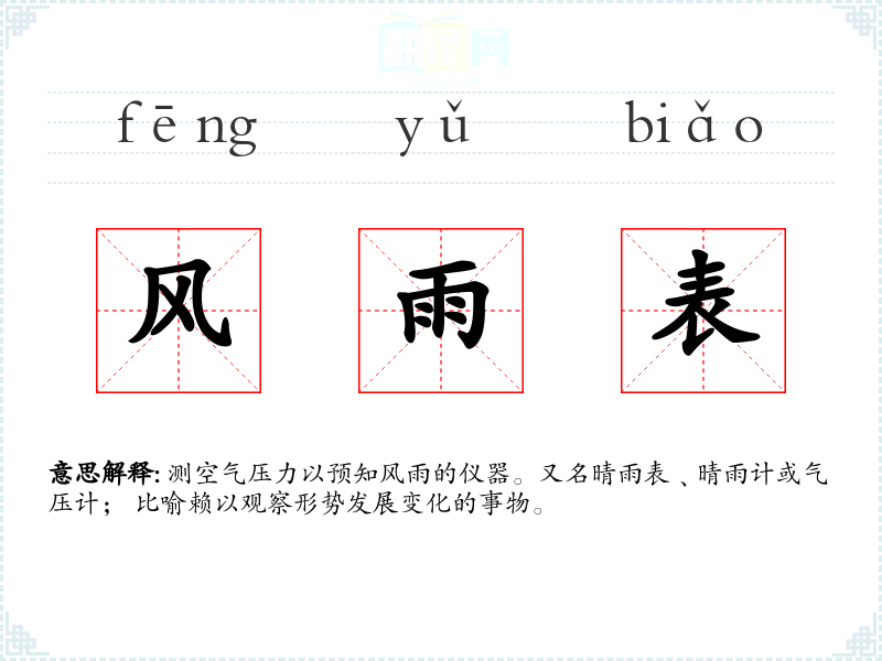 测空气压力以预知风雨的仪器。又名晴雨表﹑晴雨计或气压计; 比喻赖以观察形势发展变化的事物。