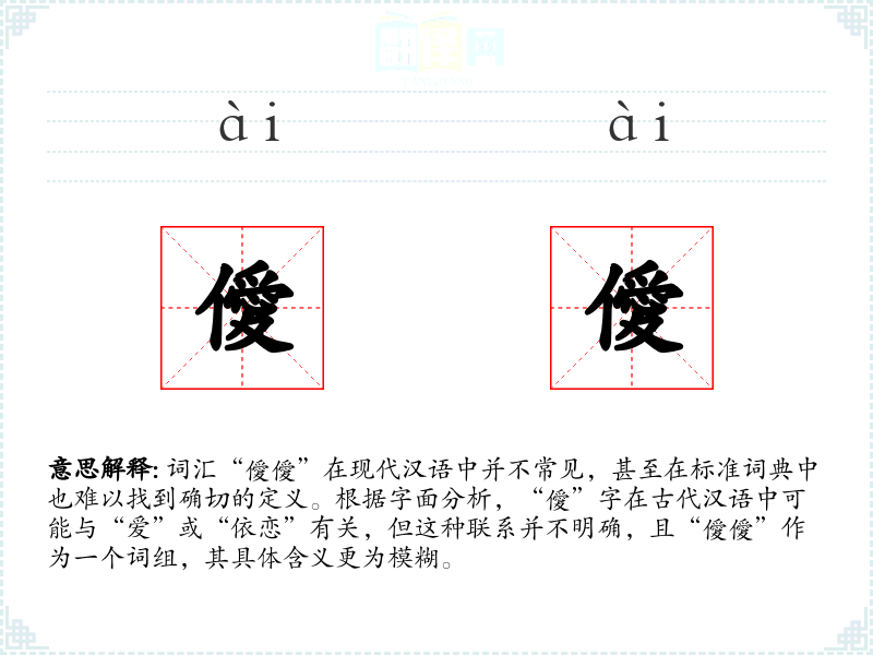 词汇“僾僾”在现代汉语中并不常见,甚至在标准词典中也难以找到确切的定义。根据字面分析,“僾”字在古代汉语中可能与“爱”或“依恋”有关,但这种联系并不明确,且“僾僾”作为一个词组,其具体含义更为模糊。