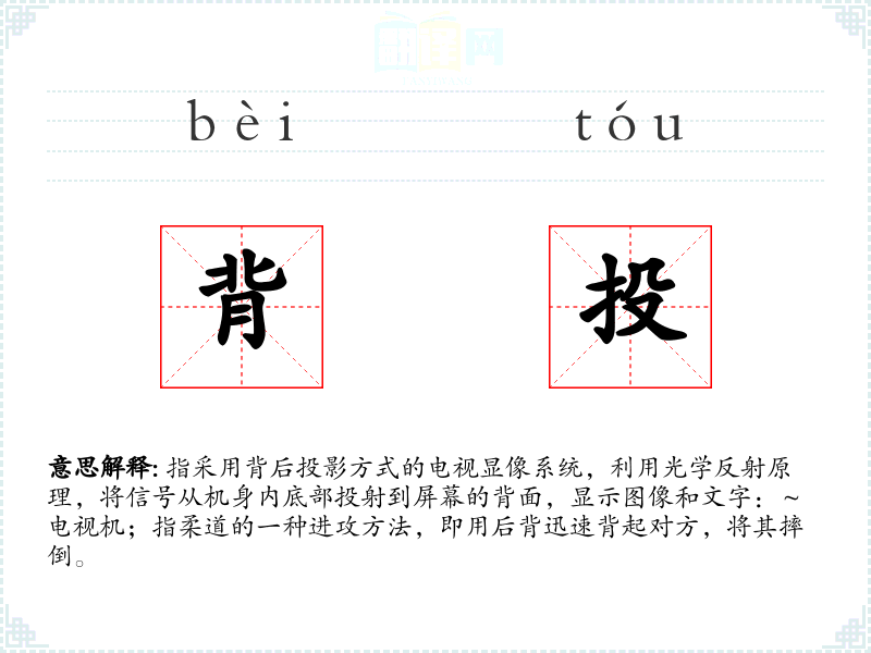 指采用背后投影方式的电视显像系统,利用光学反射原理,将信号从机身内底部投射到屏幕的背面,显示图像和文字:~电视机;指柔道的一种进攻方法,即用后背迅速背起对方,将其摔倒。