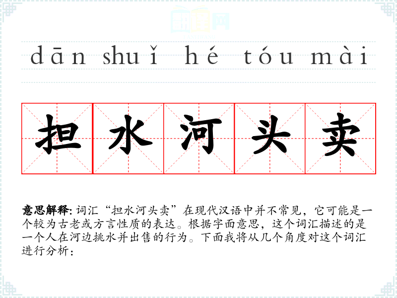 词汇“担水河头卖”在现代汉语中并不常见,它可能是一个较为古老或方言性质的表达。根据字面意思,这个词汇描述的是一个人在河边挑水并出售的行为。下面我将从几个角度对这个词汇进行分析: