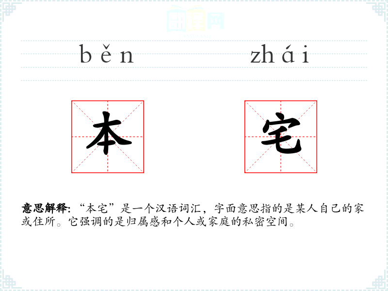 “本宅”是一个汉语词汇,字面意思指的是某人自己的家或住所。它强调的是归属感和个人或家庭的私密空间。