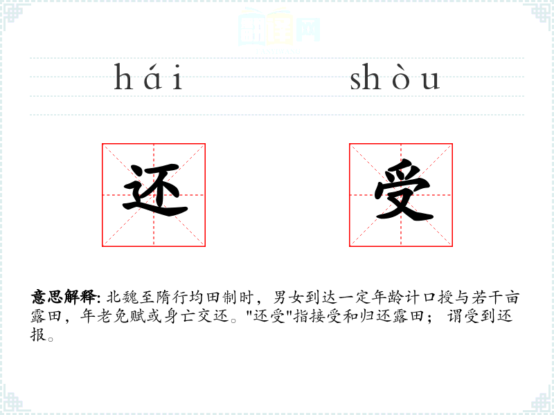 北魏至隋行均田制时,男女到达一定年龄计口授与若干亩露田,年老免赋或身亡交还。"还受"指接受和归还露田; 谓受到还报。