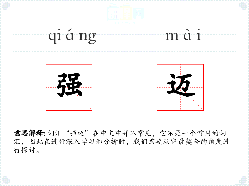 由于“强迈”不是一个常用词汇,其词源和历史演变的信息较为有限。它可能是由“强”和“迈”两个常用词汇组合而成,用以表达更加强烈的意义。