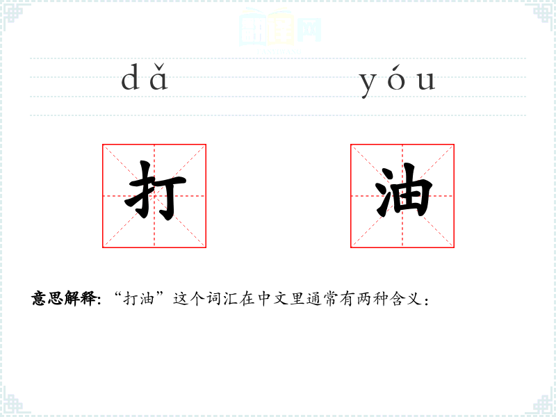 - 比喻意义:在文学和口语中,“打油”常用来形容写作或说话内容肤浅、无深度、缺乏实质内容,类似于“胡诌”或“闲扯”。