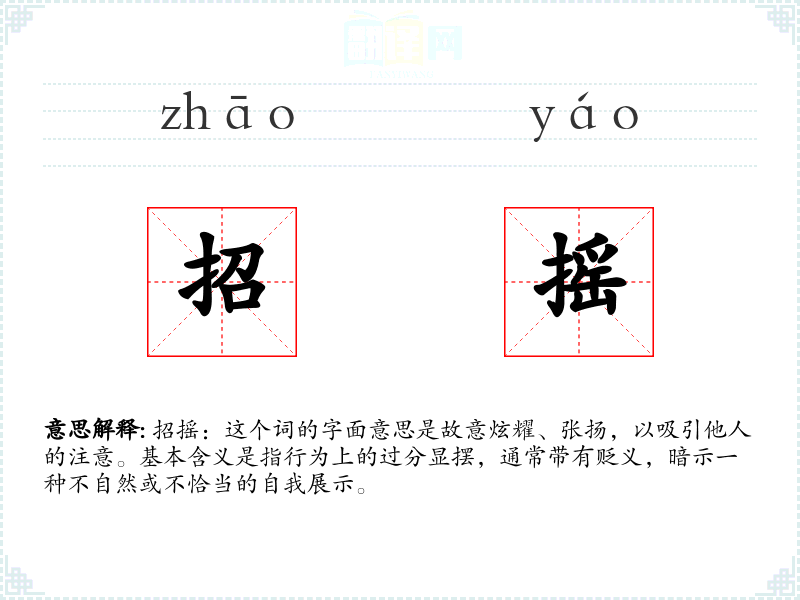 招摇:这个词的字面意思是故意炫耀、张扬,以吸引他人的注意。基本含义是指行为上的过分显摆,通常带有贬义,暗示一种不自然或不恰当的自我展示。