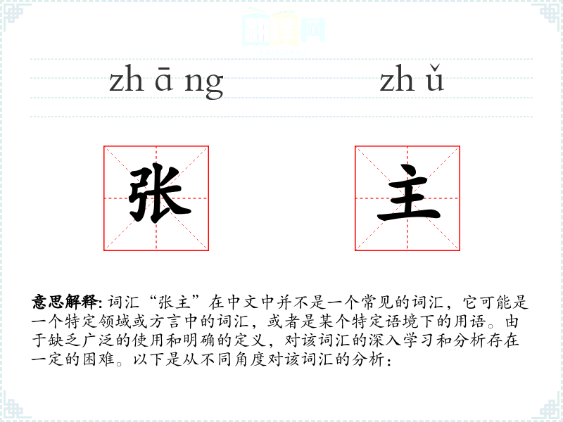 由于“张主”不是一个标准的中文词汇,我们无法提供一个确切的基本定义。它可能是某个地方方言中的词汇,或者是某个特定行业或社群中的术语。
