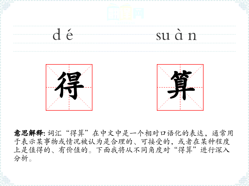 - 文学:在文学作品中,“得算”可能用于描述人物的内心活动,表达对某事物的认可或评价。