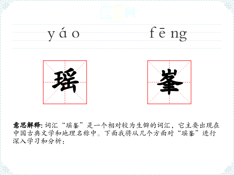 词汇“瑶峯”是一个相对较为生僻的词汇,它主要出现在*古典文学和地理名称中。下面我将从几个方面对“瑶峯”进行深入学和分析: