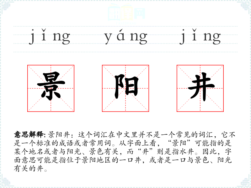 景阳井:这个词汇在中文里并不是一个常见的词汇,它不是一个标准的成语或者常用词。从字面上看,“景阳”可能指的是某个地名或者与阳光、景色有关,而“井”则是指水井。因此,字面意思可能是指位于景阳地区的一口井,或者是一口与景色、阳光有关的井。