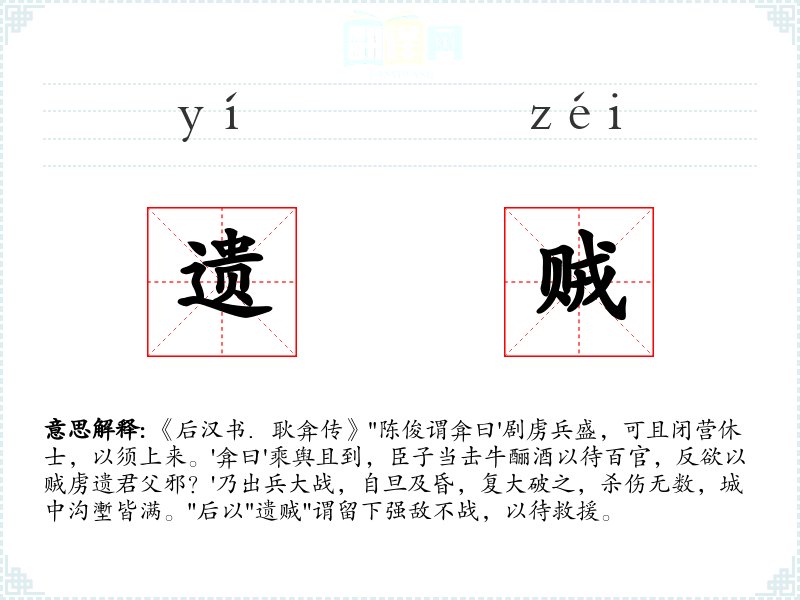 1.《后汉书.耿弇传》"陈俊谓弇曰'剧虏兵盛,可且闭营休士,以须上来。'弇曰'乘舆且到,臣子当击牛酾酒以待百官,反欲以贼虏遗君父邪?'乃出兵大战,自旦及昏,复大破之,杀伤无数,城中沟壍皆满。"后以"遗贼"谓留下强敌不战,以待救援。